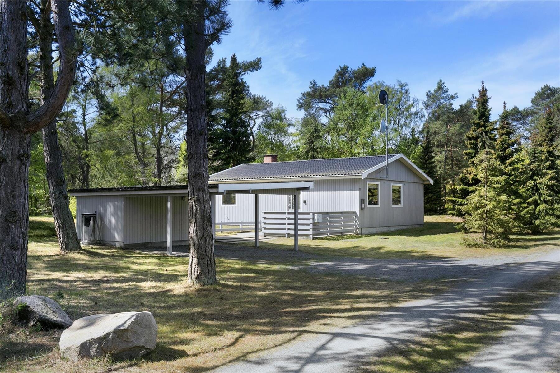 Naturgrunden er på 1.450 m2, der er græs og sand, men mulighed for at nyde solen enten på græsset eller en solvogn. Terrassen er overdækket og møbleret, der er adgang fra stuen. Her kan du nyde din frokost og du kan opleve dagen gå på hæld mens duggen falder og måske kan du høre nattergalens smukke sang. Et dejligt hus til familieferien