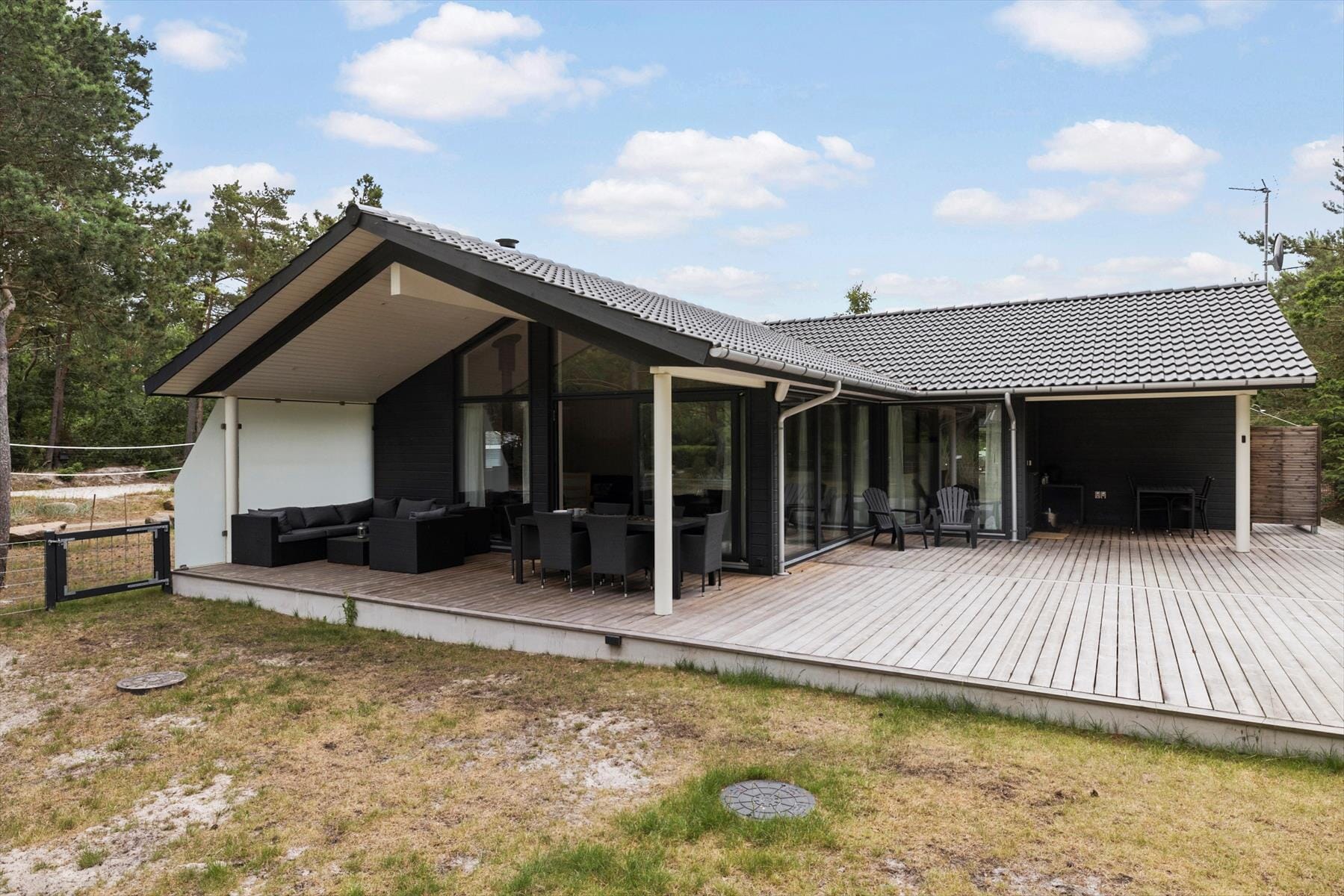 Sommerhusets store terrasse bliver hurtigt et naturligt samlingspunkt under ferien. Her kan du nyde morgenkaffen i den friske havluft, mens du skuer ud over landskabet og fornemmer duften af saltvand i brisen. Terrassen er delvist overdækket, så du kan nyde udelivet uanset vejret, og med de komfortable havemøbler er der lagt op til lange, hyggelige sommeraftener. Tænd op i grillen og tilbered en lækker middag med lokale råvarer, mens solen langsomt går ned over horisonten. Bilen kan parkeres trygt i den dobbelte carport, så du slipper for at bekymre dig om parkering under opholdet.