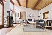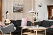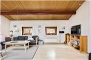 Stuen vokser nærmest sammen med køkken og spiseplads. Der er et stort vinduesparti ud mod terrassen, hvilket giver godt lys ved spisepladsen. Der er højt til loftet i alle rum. Soverummene er indrettet henholdsvis med en dobbeltseng, to enkeltsenge og to køjer. I rummet med køjer er der også en hems, hvor børnene kan lege hule. Badeværelset har bruseniche.