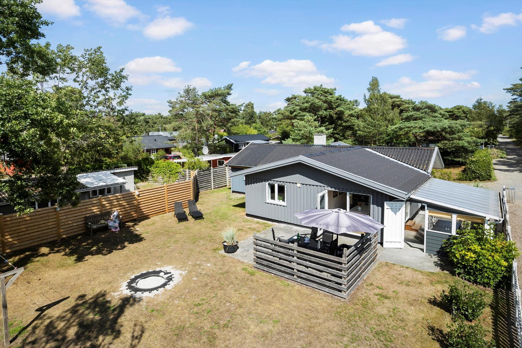 Der er en stor lukket møbleret terrasse med udgang fra stuen og en mindre åben og møbleret terrasse hvor det er muligt at nyde solen og ikke mindst tilberede en lækker aftensmad på grillen. Der er græsplæne ved huset, et fint sted at lege og spille. Bagerst i haven ligger et lille anneks, der hører med til huset, hvor ejer opbevarer private ting. Der kommer ikke nogen for at bo her så du har det hele for dig selv.