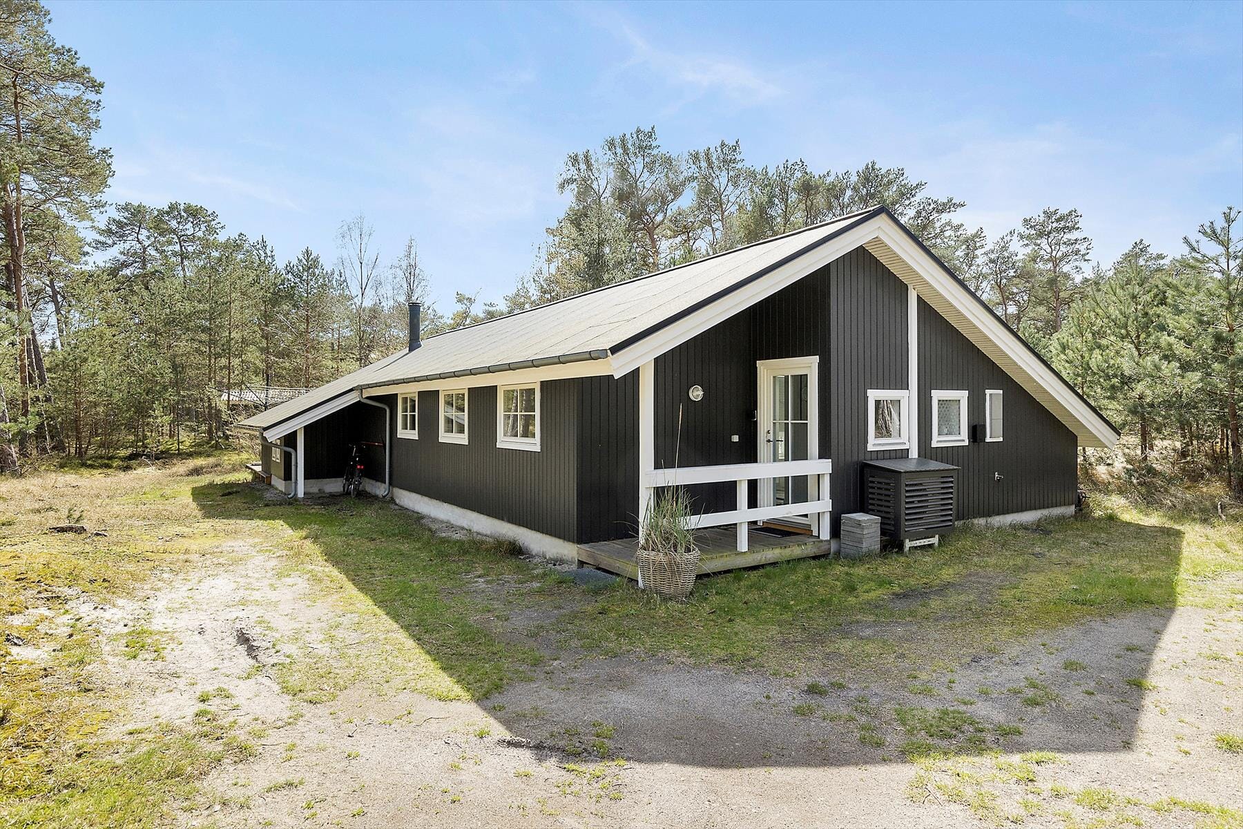 Her er terrasser mod både syd og vest, mere sol­rig­ti­ge kan de ikke blive, de er møblerede og der er en god grill. Hvis du griller en aften kan du trække ind under den overdækkede del af terrassen, her kan du fra de gode havemøbler nyde duften fra grillen og skovens fugle der altid er klar med en sang. Grunden er en na­tur­grund og er på 2.500 m2, så skal der leges og spilles, er det ikke plads der mangler. Træerne omkring huset står så langt fra, at solen har frit spil og du nyde en sagte susen, når du sidder på terrassen.