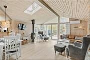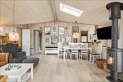Dette klassiske sort/hvide sommerhus er godt indrettet. Der er 3 soveværelser med dobbeltsenge samt skabe i to af værelserne og reol i det tredje. Stuen er stor og åben og ligger i forlængelse med køkkenet. Stuen er lys, da der er store vinduer og døre ud mod terrassen. I stuen er de spiseplads, sofaarrangement, brændeovn og tv. Der er udgang fra både stuen og køkkenet til terrassen.