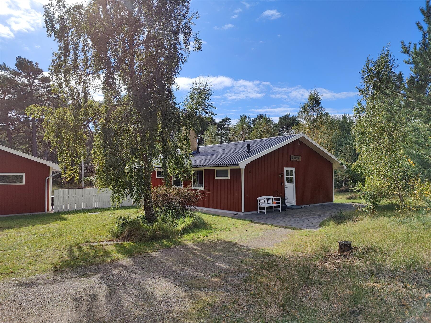 Den hyggelige terrasse er delvisoverdækket og udstyret med havemøbler, grill og liggestole. Der er også en lille terrasse ved indgangsdøren, så solen kan nydes på alle dagens tidspunkter. Huset ligger på en dejlig naturgrund, hvor det ikke er uventet, hvis de kigger et rådyr eller en hare forbi. Bilen kan parkeres lige ved huset og vejen forbi huset leder ned til stranden.