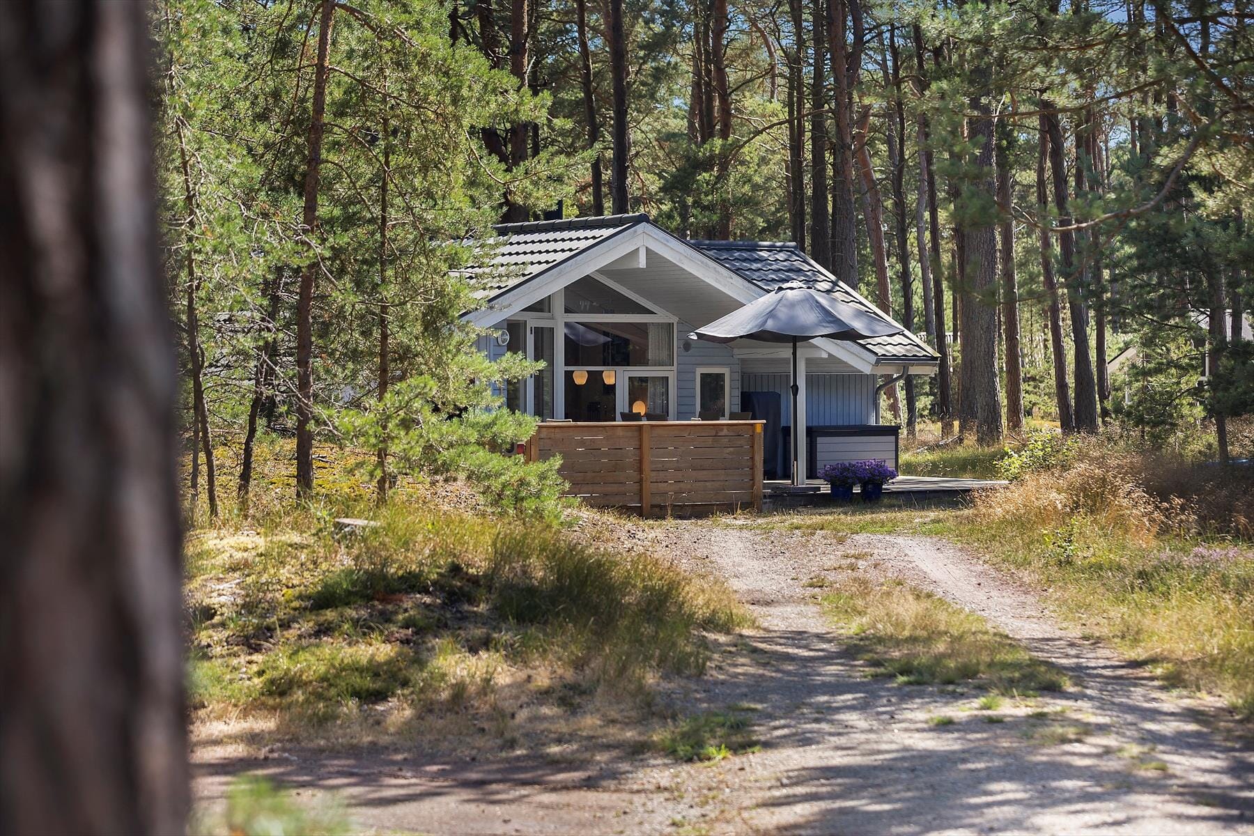 Huset har en delvist overdækket terrasse, hvor man kan sidde og nyde dagens måltider eller blot bruge lidt tid i solen. Solen kommer godt ned på terrassen på trods af, at det føles som om huset ligger midt i skoven. Nyd dagen i havemøblerne og tilberede aftensmaden på grillen. Skal der være lidt ekstra aktivitet er der plads til dette på naturgrunden ved huset. Bilen kan parkeres og oplades ved huset.