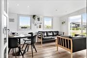 Når du træder ind i sommerhuset, mødes du af en lys og venlig atmosfære, der inviterer til ro og nærvær. Indretningen er enkel og velholdt, og du mærker hurtigt, at huset er passet godt på og indrettet med tanke på hyggelige feriestunder. Opholdsrummet samler stue og køkken i ét, så I nemt kan være sammen om madlavning, samtaler og afslapning i sofaen – måske med et spil kort eller en god bog i hænderne. De store vinduer lukker dagslyset ind og giver et dejligt kig ud til haven, så du hele tiden har naturen tæt på. Huset egner sig perfekt til en lille familie, et par eller venner, der ønsker sig en ferie med ro, nærvær og korte afstande til det hele – og at hunden også er velkommen, gør det nemt at samle hele flokken.