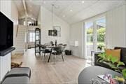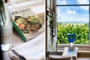 Indenfor mødes du af en lys og elegant atmosfære, hvor moderne materialer og en stilren indretning går hånd i hånd med den klassiske sommerhusstemning. Her er brændeovn i stuen, så du kan varme dig foran flammerne på kølige dage, og store vinduespartier, der slipper både lyset og naturen helt ind i rummene. Det åbne opholdsrum er husets hjerte – her kan du tilberede feriemåltider i køkkenet, dække op til fælles spisning og læne dig tilbage i sofaen, mens du nyder udsigten til det grønne landskab og fjorden i horisonten. Den lyse hems skaber ekstra plads og er et oplagt sted til både hygge og leg. Med to badeværelser, hvoraf det ene er udstyret med badekar, er der også gode muligheder for lidt ekstra luksus i hverdagen – måske med et langt, varmt karbad efter en frisk gåtur langs fjorden?