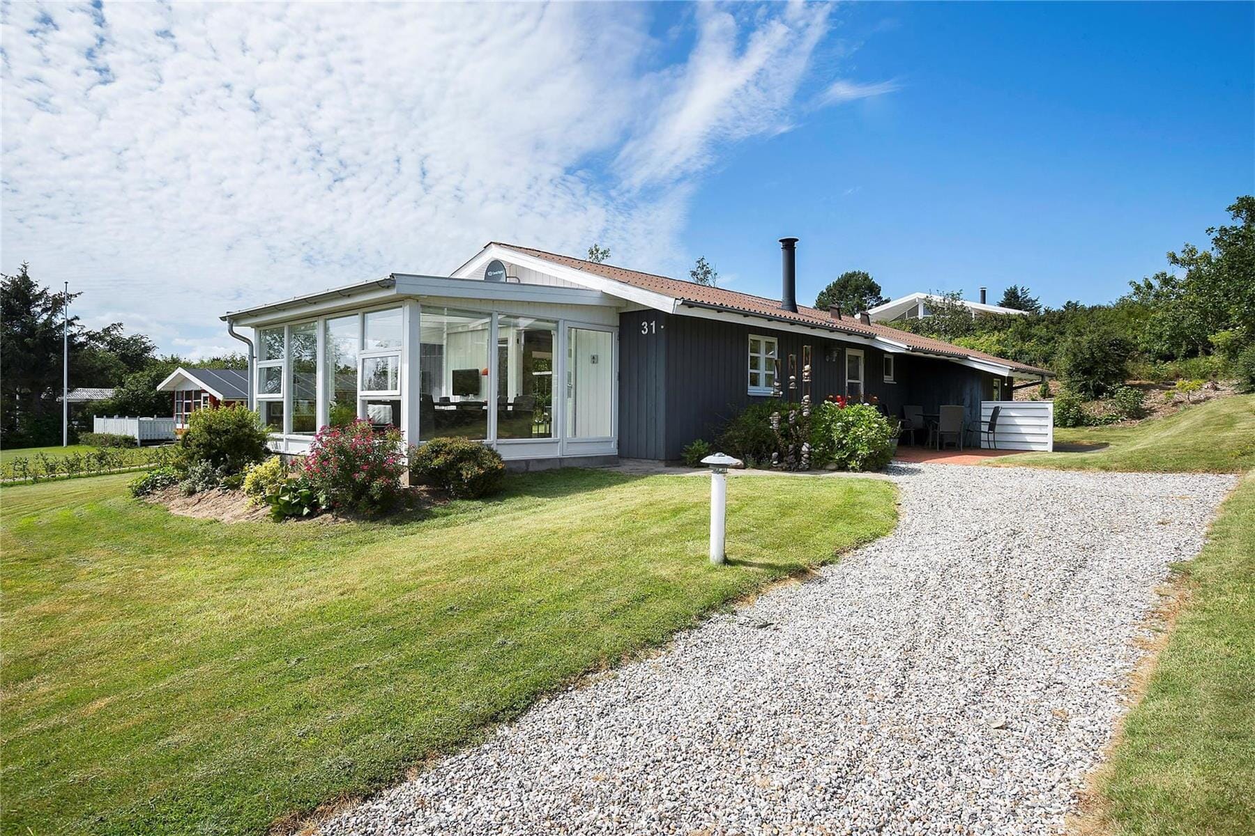 Fra både stuen og udestuen har I direkte adgang til haven og husets terrasser, så det er særdeles nemt at smutte ud, så snart solen skinner. Sommerlivet kan nydes godt tilbagelænet i liggestolene, og om aftenen kan I tænde for grillen og gøre klar til at lave mad under åben himmel. Til børnene er der gynge og sandkasse, og græsplænen er stor, hvis I vil lege fangeleg eller slå kolbøtter.