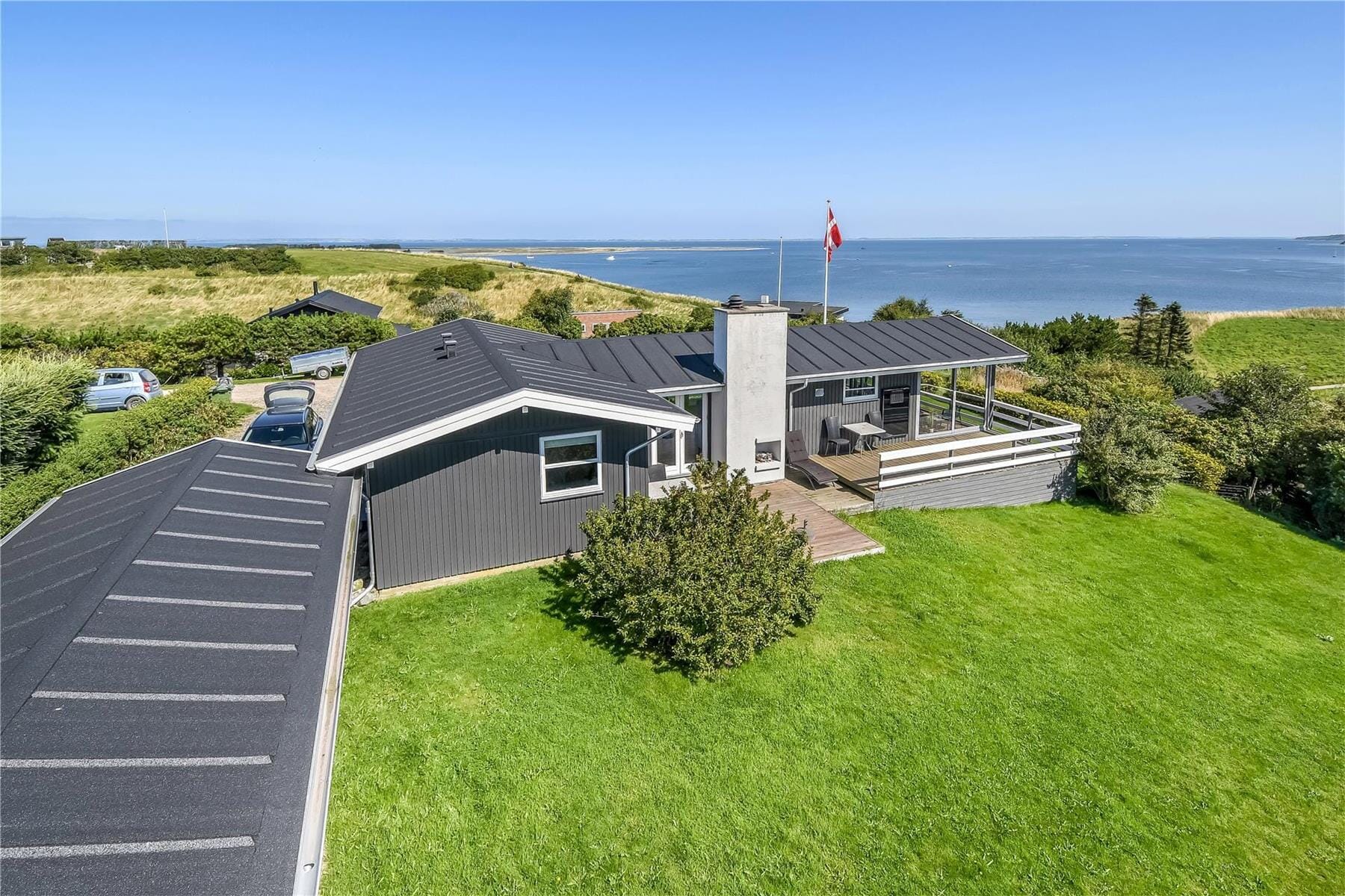 Træsommerhus med panoramaudsigt og skøn terrasse ved Gjellerodde Strand