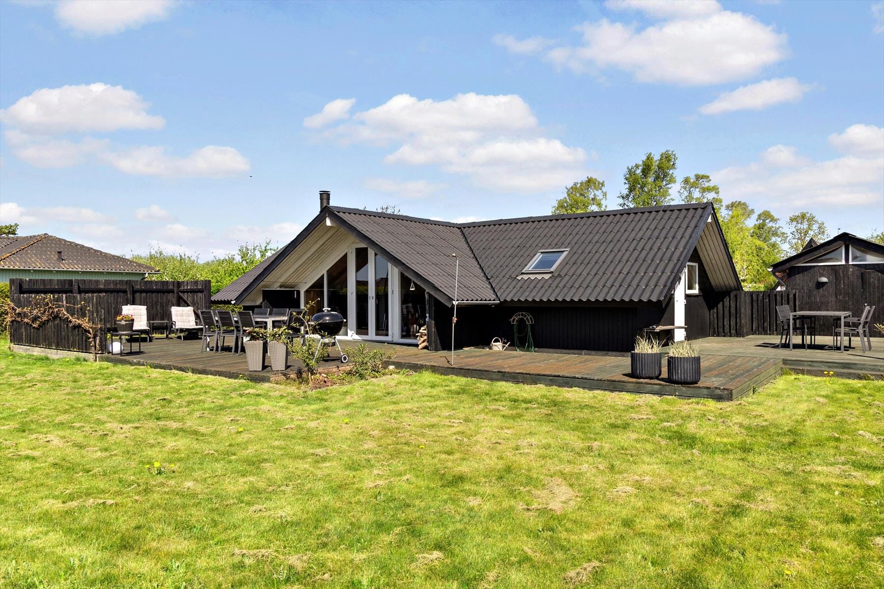 Den store, solrige træterrasse, der omgiver huset, er perfekt til af­slap­ning og udendørs hygge. Her kan du nyde mor­genkaf­fen i solen, grille lækre middage og tage en lur i skyggen på varme ef­ter­mid­da­ge. Haven, som grænser op til terrassen, er ugenert og grøn, hvilket gør den til en ideel legeplads for børn eller et fredeligt sted for voksne at nyde roen. Du kan høre fuglene synge og mærke den friske brise fra havet, som ligger i gåafstand fra som­mer­hu­set. Her er der plads til både ak­ti­vi­te­ter og af­slap­ning – måske med en god bog eller et spil badminton på plænen.