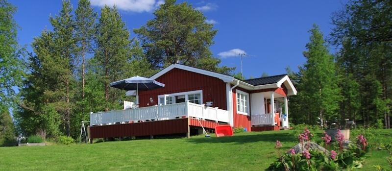 Et attraktivt feriehusensemble til to par, der ønsker at opleve midnatssolen sammen, men i separate boliger. På den øverste del af grunden, som skråner let ned mod søen, ligger hovedhuset med en stor veranda ud mod søen, hvorfra du kan nyde en storslået udsigt over vandet. Huset har et boligareal på cirka 46 m² og tilbyder plads til tre personer fordelt på to soveværelser: ét med dobbeltseng og ét med enkeltseng. Det vinkelbyggede køkken med spisebord ved vinduet afsluttes af en smuk gammel brændeovn og går over i en hyggelig opholdsstue med siddegruppe, fladskærms-tv med Chromecast (med mulighed for tyske kanaler), samt DVD- og Blu-ray-afspiller. Køkkenet er udstyret med elkomfur med glaskeramisk kogeplade og ovn, køle-fryseskab, opvaskemaskine, mikroovn og kaffemaskine. Der er også et badeværelse med brusehjørne, toilet, håndvask og vaskemaskine. Det senere opførte gæstehus ligger kun få meter fra søen og har også en åben veranda mod vandet. Det giver plads til to yderligere personer. Der er et soveværelse med dobbeltseng, et badeværelse med toilet og bruser samt et lille tekøkken med køleskab og kaffemaskine. Til begge huse hører havemøbler og en kulgrill. En ekstra motorbåd kan bookes efter behov.