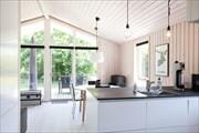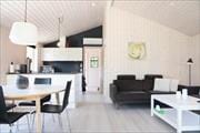 Sommerhuset er lyst og særdeles indbydende med en dejlig feriestemning. Der er loft-til-kip som giver en god fornemmelse af rummelighed, og store vinduespartier der giver et godt lysindfald i sommerhuset. Køkkenet er i åben forbindelse med stuen, så her er husets hjerterum hvor alle kan samles og drøfte dagens eller morgendagens oplevelser.