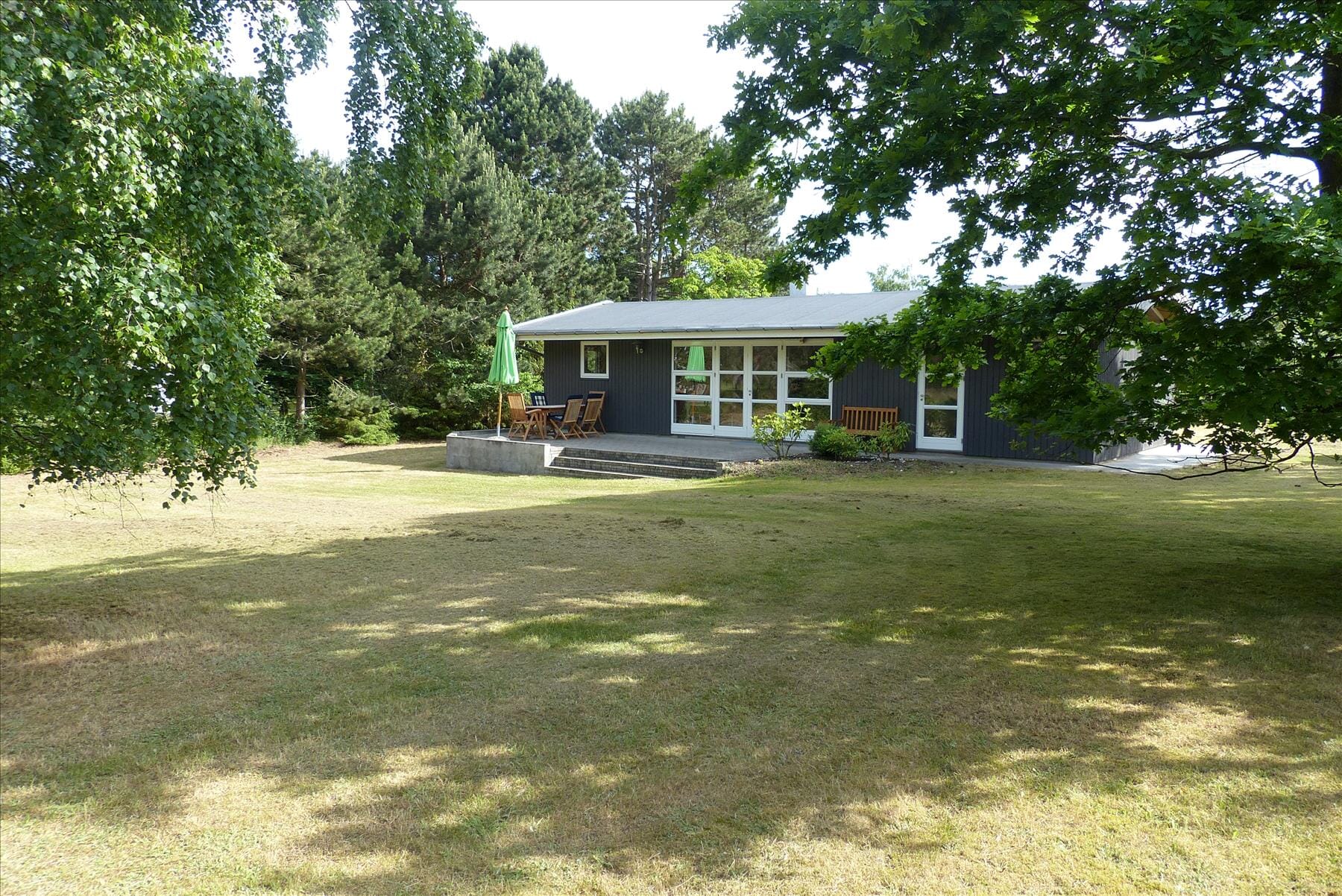 Sommerhuset ligger tilbagetrukket på en dejlig plan grund med et par store træer og har et flot vinduesparti, hvor du fra den åbne stue kan nyde udsigten til haven fra både spisebordet og sofaen. Sommerhuset er lyst indrettet, med et moderne tvist. Mens brændeovnen, der er placeret midt i huset mellem det åbne køkken og stuen, sørger for varmen, kan du finde et spil frem til glæde for hele familien. Er der sommer og sol, så slå dørene op til terrassen og lad solens stråler sende lys og varme ind.