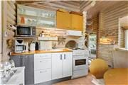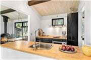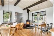 I dette hyggelige sommerhus er den originale charme bevaret og hvad du ikke finder af storhed, finder du i hyggelige og originale detaljer, blandt andet flere blyindfattede vinduer med farvet glas. I stuen finder du brændeovnen og en hyggelig seng indrettet som en slags fortællesofa, og i havestuen ved siden af har du kig ud til haven fra vinduerne og kan sidde ved spisebordet til måltiderne.
