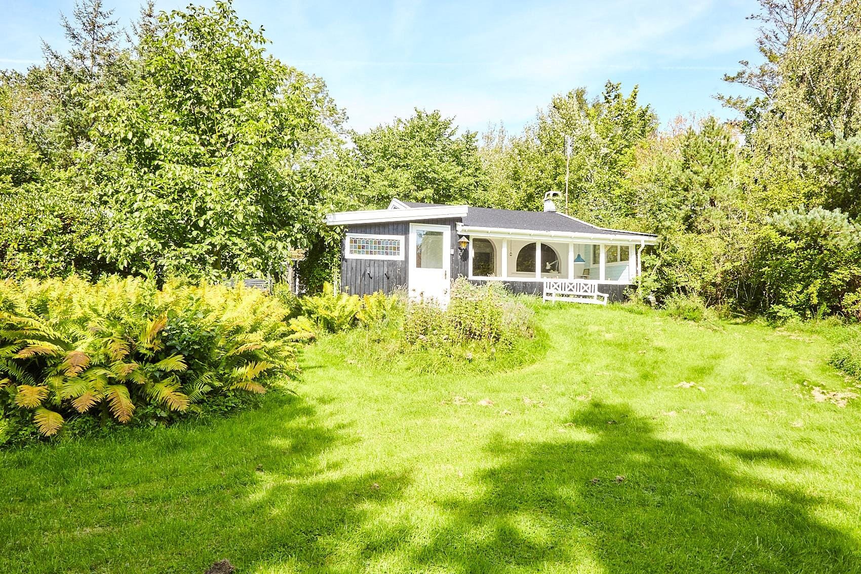 I dette hyggelige sommerhus er den originale charme bevaret og hvad du ikke finder af storhed, finder du i hyggelige og originale detaljer, blandt andet flere blyindfattede vinduer med farvet glas. I stuen finder du brændeovnen og en hyggelig seng indrettet som en slags fortællesofa, og i havestuen ved siden af har du kig ud til haven fra vinduerne og kan sidde ved spisebordet til måltiderne.