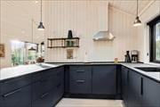 Køkkenet er rummeligt og stilfuldt med alle de faciliteter, man har brug for, og så er der god plads til at lave mad. Det åbne køkken/alrum inviterer til hyggelige stunder, hvor man både kan stå i køkkenet og være sammen med dem, der har sat sig til rette i sofamøblerne. Ved det centrale køkkenbord er der to højstole, hvorfra man kan tale med kokken eller hjælpe til med madlavningen.