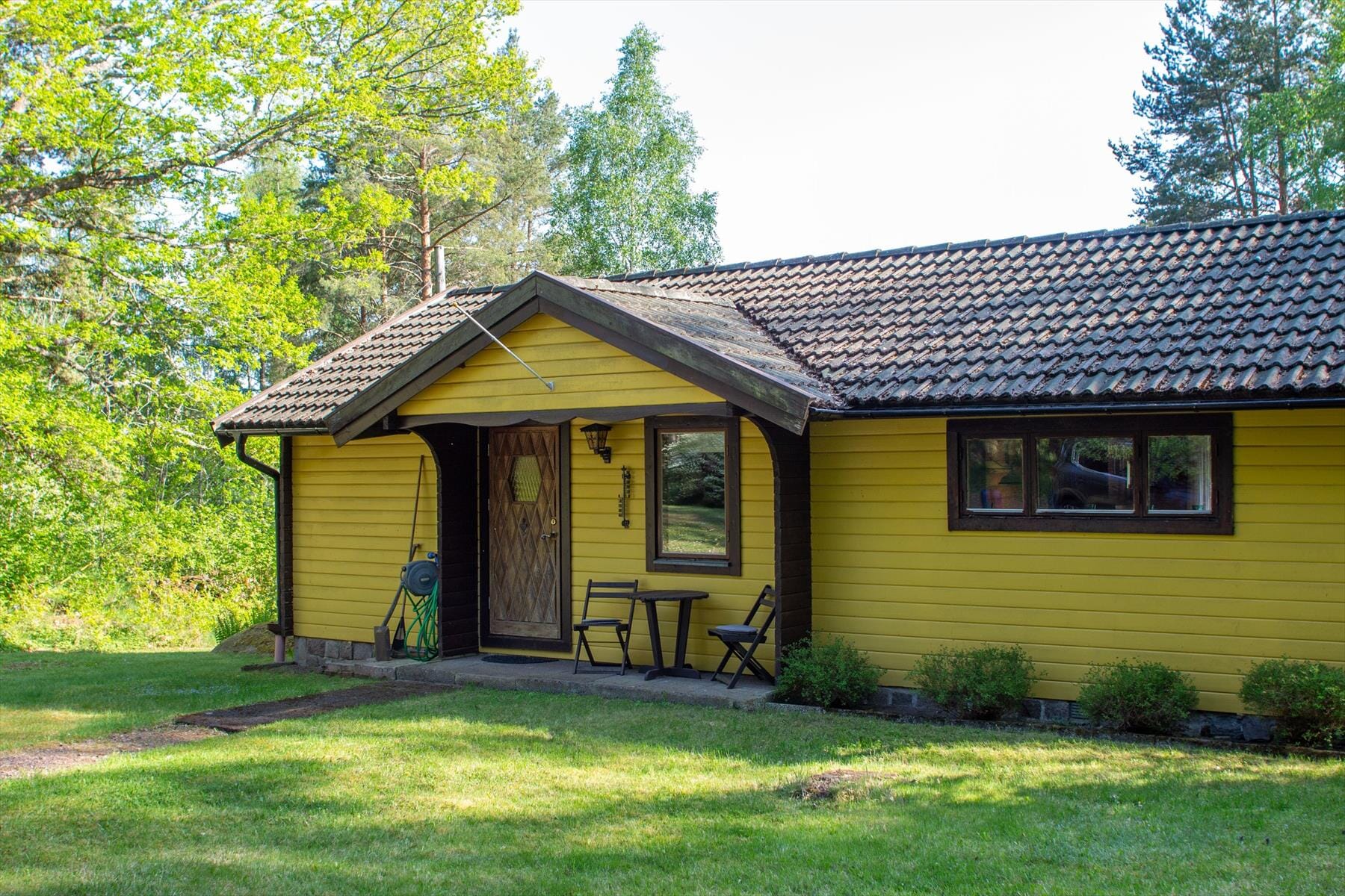 Den store veranda, som løber langs hele husets bagside, giver masser af plads til hyggelige stunder udendørs. På den store græsplæne er der rigeligt med plads til leg, afslapning eller solbadning. Havemøbler og grill er til rådighed. Du kan parkere direkte ved huset. Et særligt højdepunkt: En robåd kan efter behov lejes for 100 SEK pr. dag hos den nærliggende nabo (udlejers svoger) – perfekt til små opdagelsesture på Gyllingesøen.