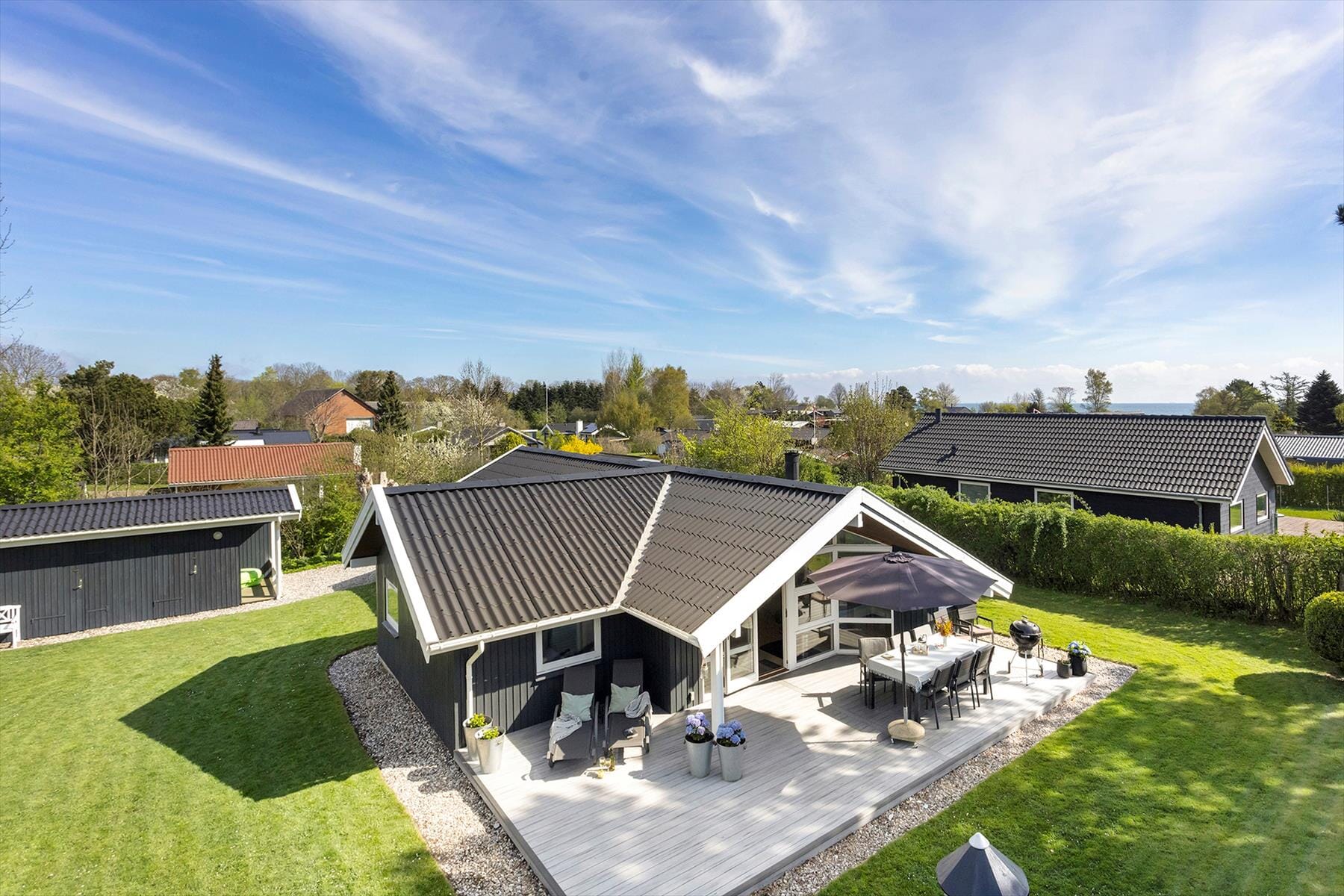 Den store og ugenert have omkring sommerhuset er en grøn oase, hvor både børn og voksne kan udfolde sig. Her er masser af plads til leg, afslapning og måltider under åben himmel. Den dejlige terrasse indbyder til lange, dovne sommerdage, hvor du kan nyde morgenkaffen i solen eller grille aftensmaden, mens solen går ned over trætoppene. Haven er ideel til afslapning i fredelige omgivelser, og det er nemt at finde både sol og skygge i løbet af dagen. En af sommerhusets helt store fordele er den korte afstand til stranden – kun få minutters gang, og du står med fødderne i sandet. Her finder du også en fælles badebro, hvorfra du kan tage en frisk dukkert, fiske eller bare nyde udsigten over Storebælt. Det maritime miljø og de børnevenlige forhold ved stranden gør området perfekt til både afslapning og aktiviteter for hele familien.