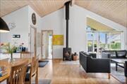 Når du træder indenfor i dette sommerhus, mødes du af en lys og indbydende atmosfære. De skrå lofter og store vinduespartier giver en fornemmelse af rummelighed og bringer masser af dagslys ind i rummene. Stuen er indrettet med komfortable møbler, og brændeovnen i hjørnet sikrer hyggelige stunder, når aftenen falder på. Køkkenet er åbent og moderne med alt, hvad du behøver for at tilberede lækre feriemåltider. Efter en dag fuld af aktiviteter kan du lade dine muskler slappe af i husets spabad eller tage en tur i saunaen for en ægte wellness-oplevelse. Huset rummer gode soveværelser, hvor du kan se frem til en god nats søvn.