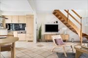 Inden døre i ferieboligen, der nærmere bestemt er et gedigent rækkehus, kan I brede jer på to etager, som begge fremstår lyse, indbydende og velindrettede. Hele stueplan er dedikeret til fælles hyggestunder og familieliv, for udover en entré er alle kvadratmeter brugt på en stor stue med sofaafdeling, spiseplads og integreret køkkenafdeling. Et stort fladskærms-TV kan stå for underholdningen, når I er færdige med aftensmaden, og hvis det er køligt udenfor, kan I tænde for varmepumpen, mens I slænger jer i sofaen. Den er for øvrigt en sovesofa, så ved nattetid kan den fungere som sengeplads til to personer, hvilket er et glimrende supplement til de komfortable senge på førstesalens to soveværelser. På førstesalen finder I desuden et pænt badeværelse, der er udstyret med bruseniche og vaskemaskine.