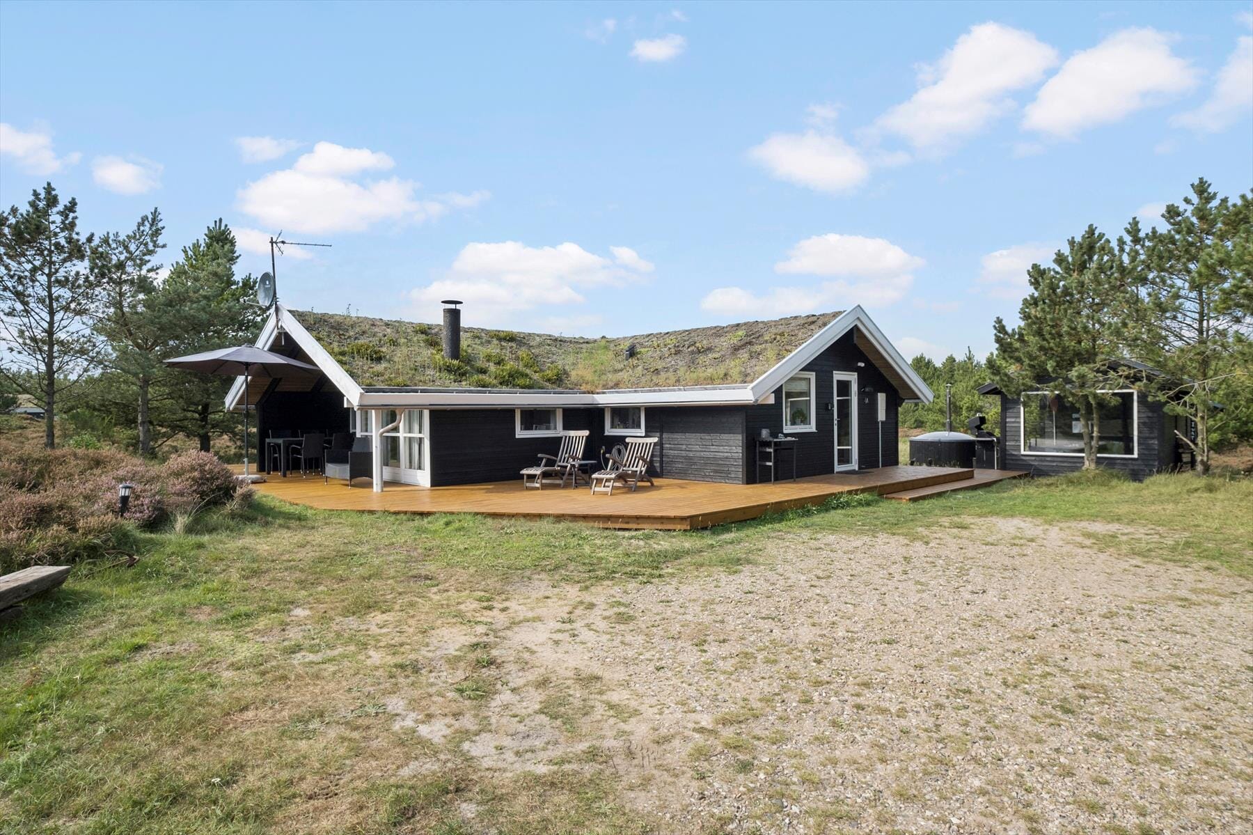 Med sin mørke træfacade og sit levende tag falder sommerhuset nærmest i ét med de naturskønne omgivelser. Atmosfæren er også helt i top inden døre i opholdsrummet, for her er der loft til kip og lyse trælister på væggene, og en brændeovn hører med til husets charmetræk. Planløsningen er åben, så stue og køkken er forenet, og gennem de store vinduespartier får I glæde af sollyset og den flotte udsigt over hede landskabet. Ligesom opholdsrummet er sommerhusets tre soveværelser lyse og indbydende, og det samme er gæstetoilettet og badeværelset, hvoraf sidstnævnte endda er udstyret med en sauna.