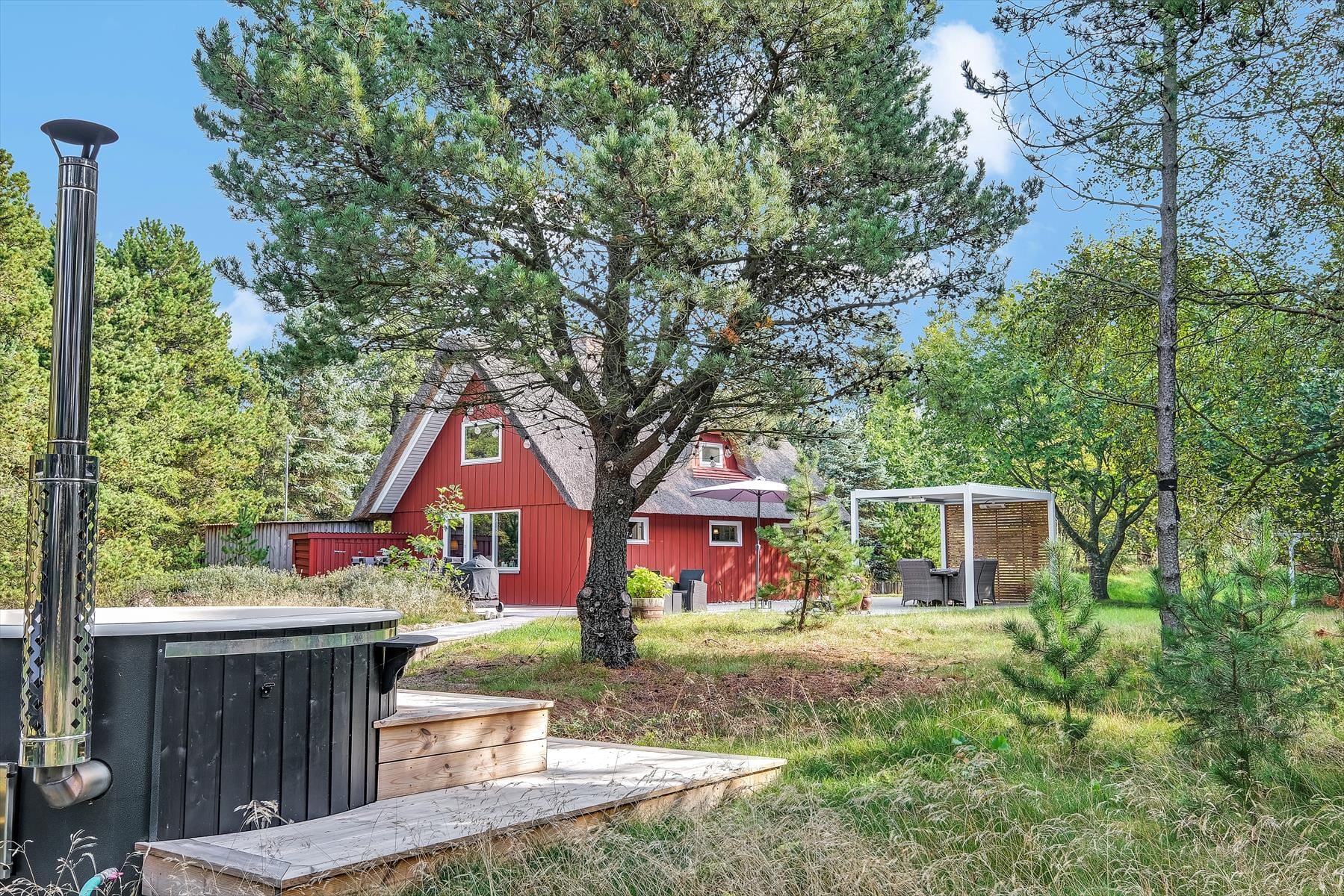En stor træterrasse breder sig rundt om tre af husets sider, så der er masser af plads til at sole sig i en ugeneret lækrog, tilberede aftensmaden på grillen og bare tage dagene i helt roligt tempo. Der er et overdækket areal og en parasol til rådighed, hvis du trænger til skygge, og hvis det er wellness og afslapning, du drømmer om, er det perfekt at slutte dagen af i vildmarksbadet. At sidde her, med udsigt til naturgrundens flotte træer eller under stjernehimlen, må være den perfekte opskrift, hvis du har brug for en rolig og tilbagelænet sommerhusferie!