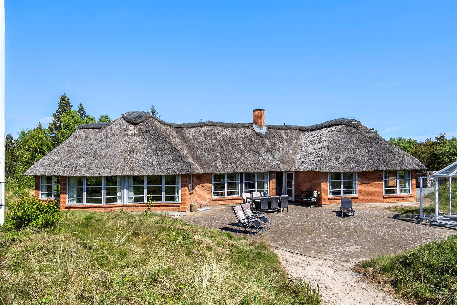 Huset er opført i 1996 og tager sig flot og indbydende ud med rødstensfacade, stråtag og hvide sprossevinduer. Det gode førstehåndsindtryk fortsætter, når du træder indenfor i ferieboligen, hvor pladsen er særdeles generøs. De sammenhængende opholdsrum sætter en dejlig ramme om det hyggelige samvær på ferieturen, og du kan sidde og nyde den omgivende natur gennem de store vinduespartier. Bemærk desuden, at der er udgang til terrasser og have fra alle husets opholdsrum. Der er to soveværelser i stueplan, mens de øvrige to er placeret på førstesalen. Huset er som noget helt særligt udstyret med to køkkener, og med tre badeværelser – det ene med sauna og et wellnessrum med spabad og motionsudstyr – er der skruet ekstra op for velværefaktoren. Du får også et aktivitetsrum med poolbord og bordfodbold.