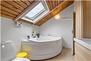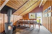 Balancen mellem klassisk sommerhuscharme og luksuriøs komfort er virkelig velfungerende i sommerhuset, der er opført i 1986 og renoveret i 2009. Skråvæggene med rustikke trælister giver masser af personlighed til huset, som samtidig er fuld af lækre elementer – inklusiv et flot åbent køkken og et badeværelse med spabad. Vil I kombinere det afslappende spabad med en tur i saunaen, kan det sagtens lade sig gøre, for der er sauna i annekset ved siden af sommerhuset. Det førnævnte køkken er integreret med stuen, og alt i alt er det et særdeles hyggeligt opholdsrum, endda med brændeovn og et dejligt lysindfald fra tre verdenshjørner. Soveværelser er der tre af, og de er alle indrettet med dobbeltseng.