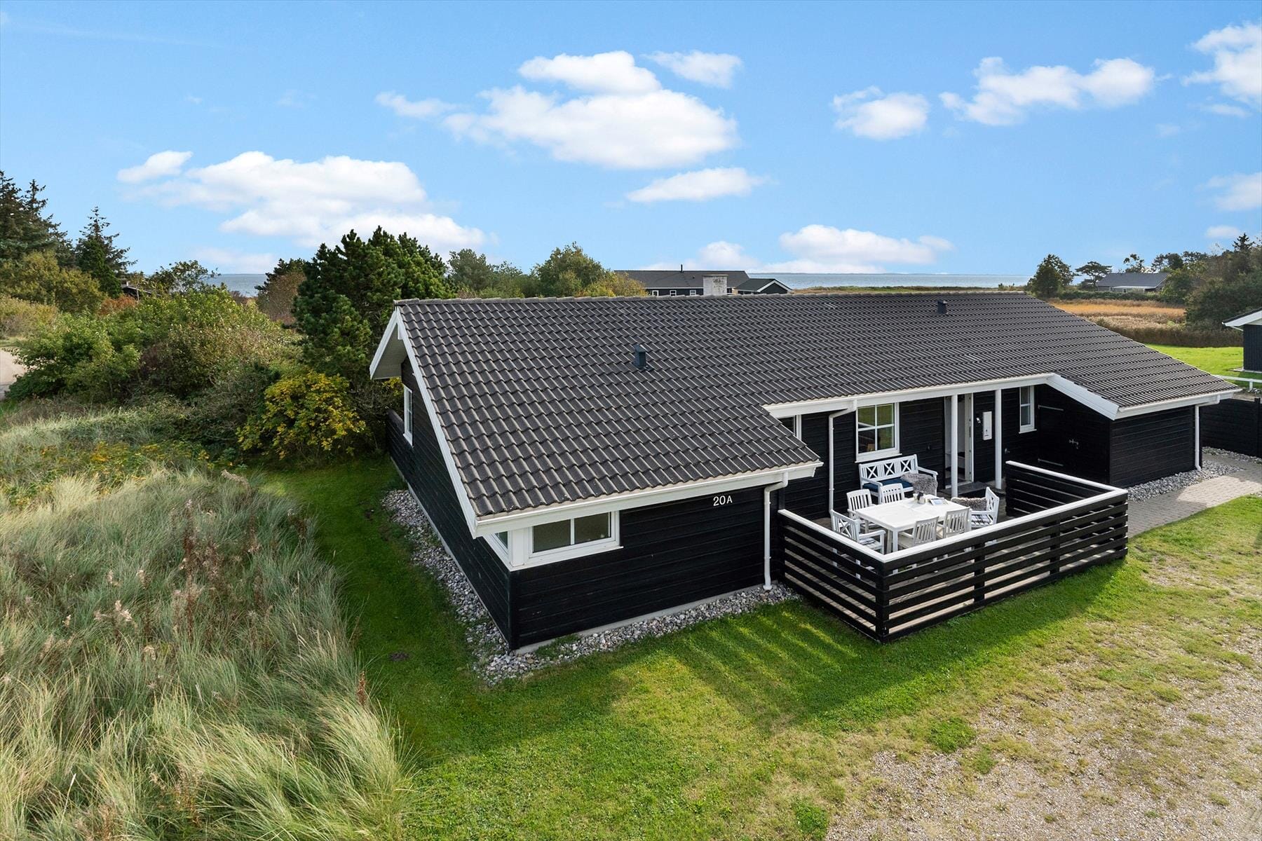Ude i det fri kan du se frem til at nyde solen og ferielivet på sommerhusets store terrassemiljø. Der er opholdspladser på tre af husets sider, og mod sydøst kan du endda nyde synet af Vadehavet, når du slapper af i de fredelige omgivelser. Nær sommerhuset indbyder græsplænen til leg og boldspil, mens resten af den 2500 m² store grund er holdt på en mere naturlig og vild måde.