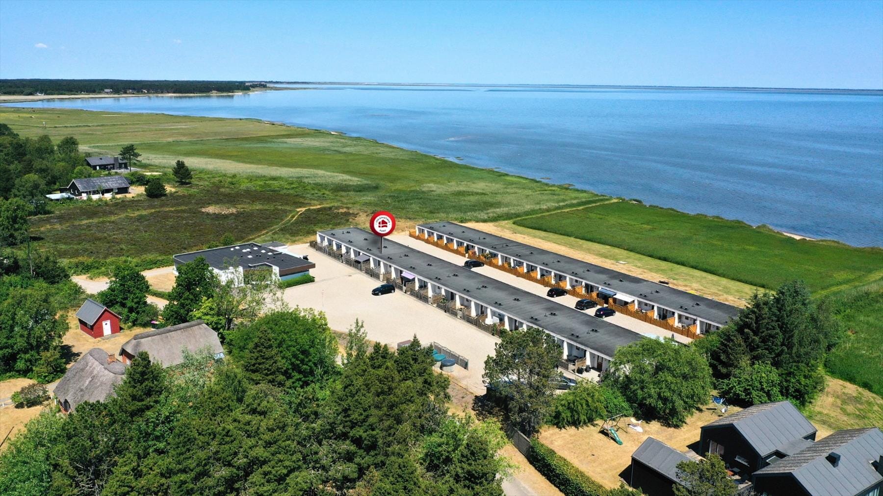 Mere præcist er der tale om et rækkehus på 37 m², der ligger i anden række ud mod kysten, og på grund af bebyggelsens særlige arkitektur og placering har I udsigt til vandet fra stuen. Samtidig kan I nyde det dejlige lysindfald gennem det store vinduesparti – der ovenikøbet har havedør, så det er let at træde ud på terrassen på lune solskinsdage. Når I hygger jer inden døre, kan det foregå omkring spisebordet eller på afslappet vis i sofaen, og I kan selvfølgelig også bruge noget af tiden på at lave mad i det åbne køkken. Sofaen er for øvrigt en sovesofa, så om natten kan stuen bruges som soverum for to personer, mens det tilstødende soveværelse er indrettet med to enkeltsenge. Et badeværelse med brus hører for øvrigt også med til planløsningen.