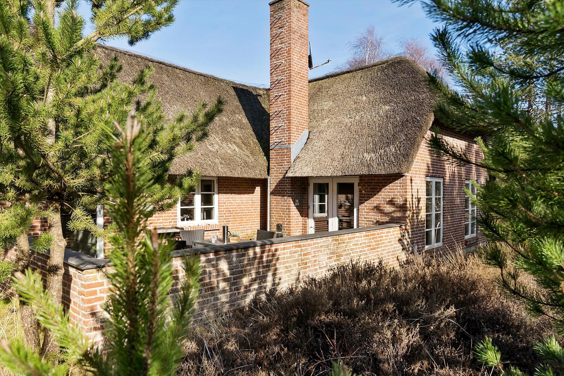 Udenfor ligger en fredelig, lukket terrasse med komfortable havemøbler, tilgængelig både fra køkkenet og opholdsrummet — et oplagt sted til morgenkaffen i solen eller en eftermiddagsstund med udsigt til træernes bevægelse. Huset virker næsten som sat ned midt i skoven; træerne og planterne omslutter huset og giver en fornemmelse af at være snoet ind i naturen, hvor du sidder skjult og alligevel tæt på åbne landskaber. Den lukkede terrasse og de omkringliggende grønne arealer giver privathed og ro, så du kan nyde fuglesang, duften af skovbund og hvert åndedrag af frisk, saltblandet luft fra Vesterhavet.