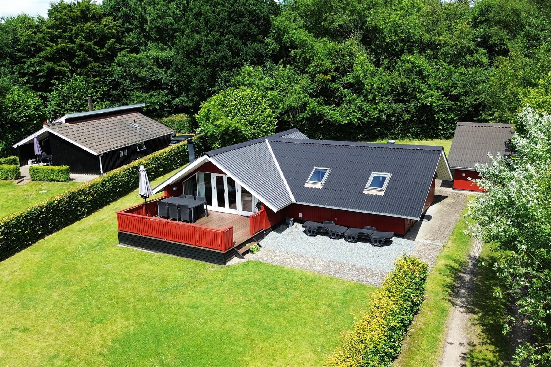 Sommerhuset grønne grund byder på en dejlig græsplæne, der fint kan bruges som underlag, hvis I vil kaste med frisbee, lege fangeleg eller slå kolbøtter. I kan også bare slænge jer i græsset, mens I kigger op på de drivende skyer og lytter til fuglesangen fra det tilstødende skovstykke – den form for driverliv er der nemlig tid til, når det er ferie! En tilbagelænet stund på den sydvendte terrasse kan selvfølgelig også lade sig gøre, og hvis du vil forkæle familien med et friskgrillet måltid under åben himmel, er det også her, det kan foregå.