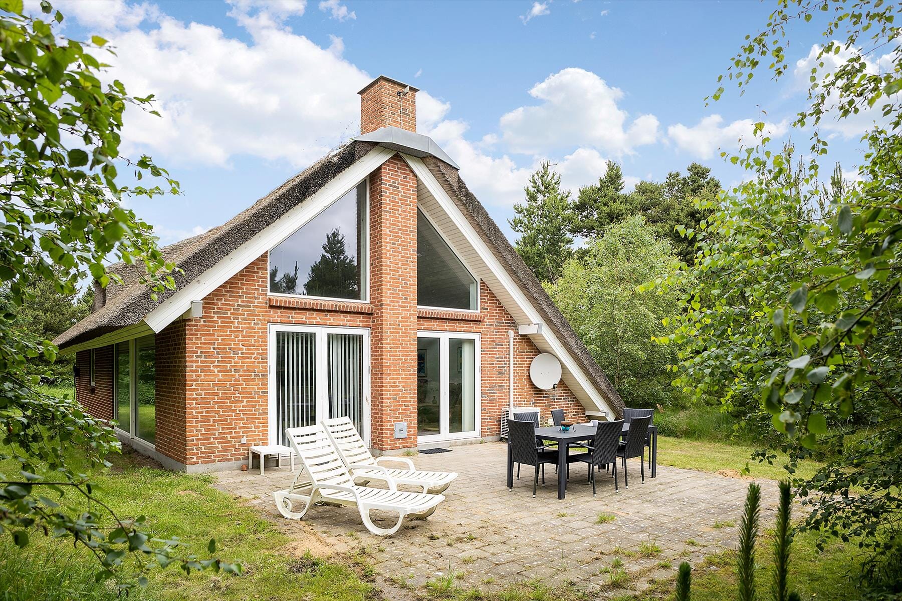 Hvis du eller en af dine kære har tryllet et lækkert måltid frem i køkkenet, kan I overveje, om maden skal nydes ude i det fri, når vejret er lunt og sommerligt. En stor terrasse breder sig i forlængelse af stuen, og her er der gode muligheder for at finde en solrig opholdsplads det meste af dagen. Og hvis I skulle være mere til skygge, kan I rykke ind under parasollen i stedet. Feriestemningen er helt i top, når der er gang i grillen, og børnene leger gemmeleg mellem naturgrundens træer – eller når I bare sidder tilbagelænet i havestolene og nyder Sønderstrand-områdets fred og ro.