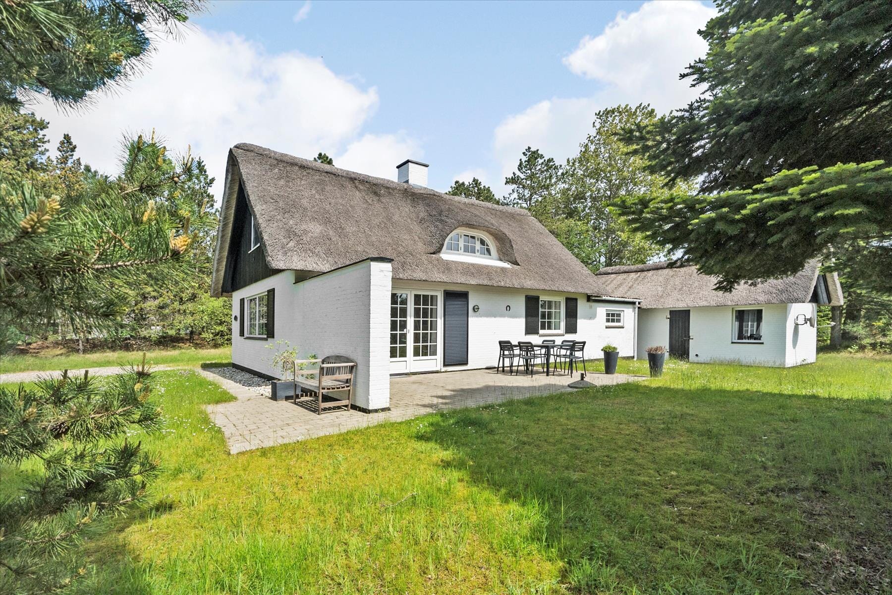 Den 2500 m² store naturgrund er et herligt sted at nyde ferietilværelsen, når solen skinner, og det er mildt eller ligefrem lunt i vejret. Har du små børn med på ferie, kan de gynge og lege i sandkassen, mens legebørn i alle aldre kan boltre sig og spille havespil på græsplænen. Trænger du mere til frokost eller en siesta i en liggestol, kan du slå dig ned på den sydvendte terrasse.