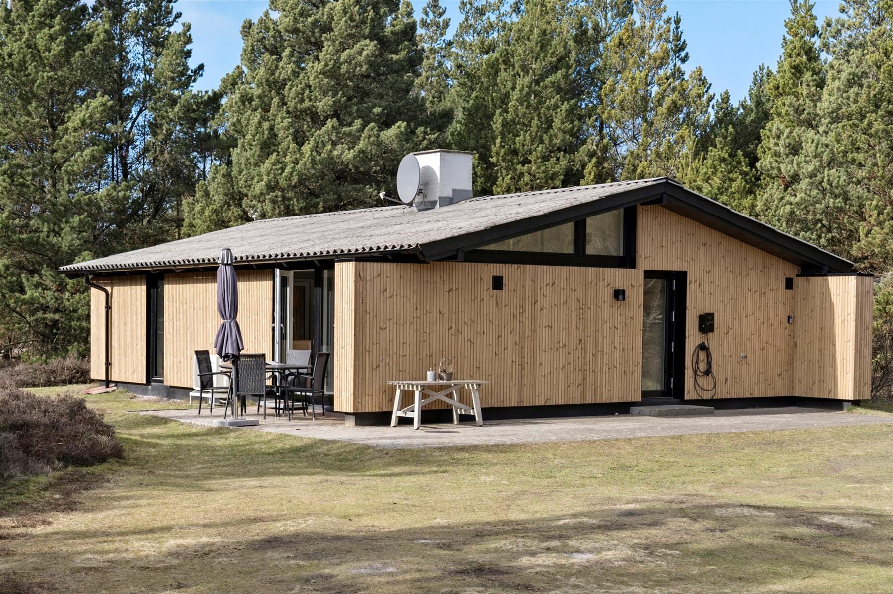 Udenfor folder en dejlig, ugeneret naturgrund sig ud, omkranset af lyng og lav bevoksning, som er et fantastisk syn, når lyngen står i blomst. To terrasser med havemøbler giver mulighed for at fange sol eller søge skygge — den ene terrasse er delvist overdækket og perfekt til rolige morgener. I kan tænde op i vildmarksbadet og synke ned i det varme vand under åben himmel; om natten bliver oplevelsen ekstra magisk, når stjernerne spejler sig, og vinden bærer duften af lyng ind over dig. Grundens private rammer giver både plads til leg for børn og stille stunder for voksne, og her er rig lejlighed til at lytte til fuglesang beundre udsigten til naturens farver.