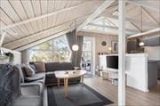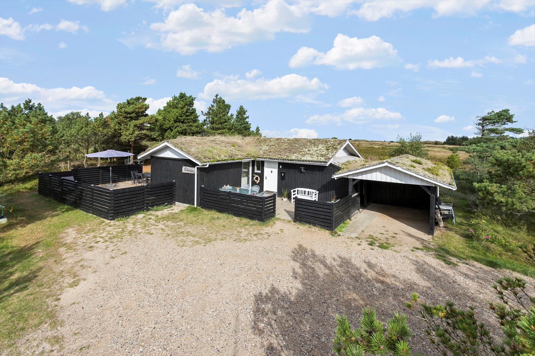 Et af charmetrækkene ved ferieboligen er det grønne tag, der får huset til nærmest at smelte sammen med naturomgivelserne. Inden døre er stemningen også i top, for her er der hvidmalede trælister på væggene og brændeovn på vaskeægte sommerhusmanér. En sauna hører desuden med til planløsningen, og fra køkkenet, stuen og et af de tre soveværelser kan I nyde den fine udsigt over den lyngklædte hede. Køkkenet ligger i åben forbindelse med stuen, hvor I kan slænge jer i de komfortable siddemøbler og gøre klar til en hyggelig eftermiddag med brætspil og snacks omkring spisebordet. På praktisk vis er der både et badeværelse og et gæstetoilet i sommerhuset, og på gæstetoilettet er der for øvrigt vaskemaskine, så I kan friske feriegarderoben op, hvis I kommer til at spilde is på sommertøjet.