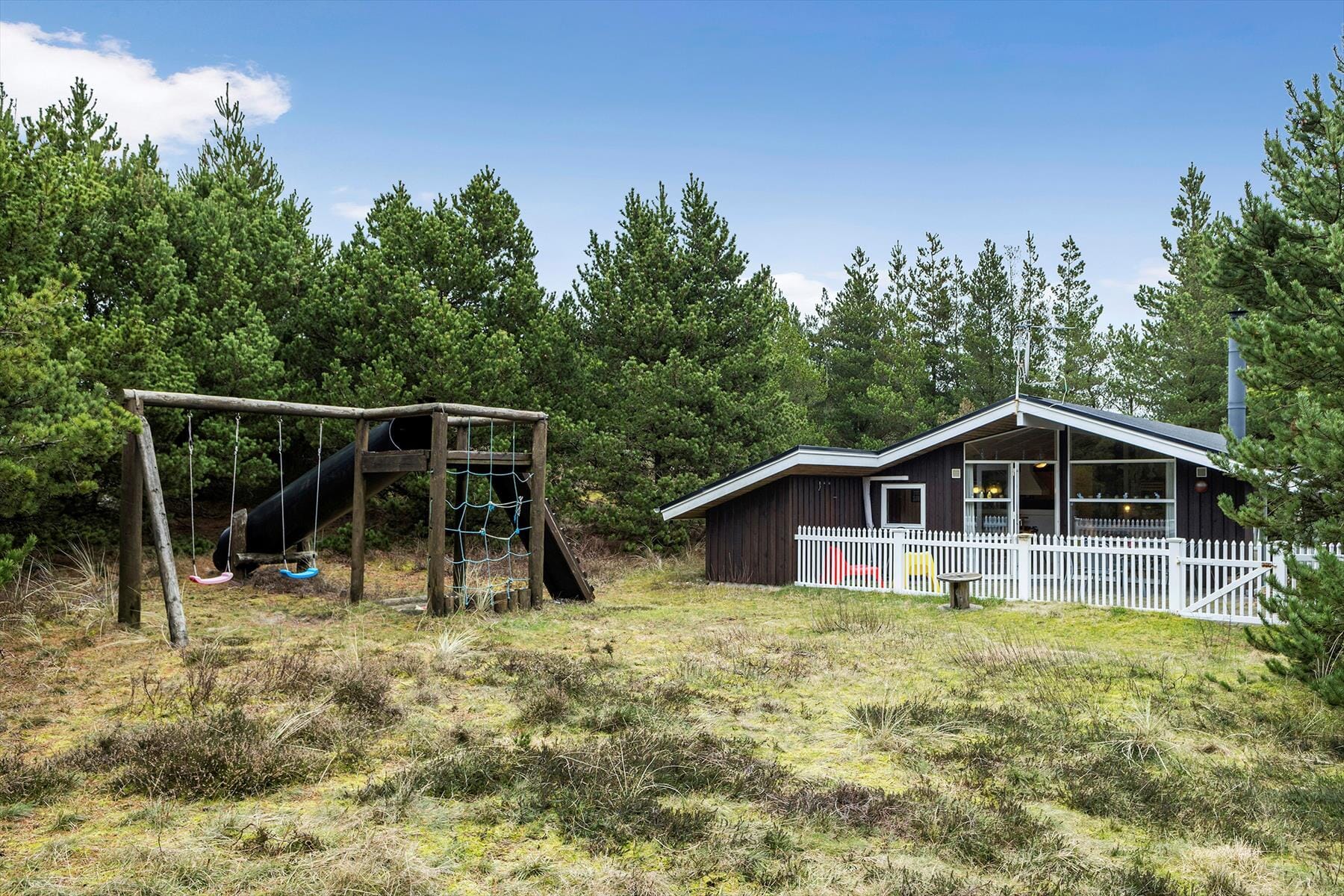 En stor og dejlig terrasse, der skærmes af et hvidt stakit, breder sig øst, syd og vest for sommerhuset. Med andre ord får du nemt ved at finde en opholdsplads i solen det meste af dagen – og lige meget hvor du sætter dig, er du omgivet af naturgrundens træer, der rammer udearealerne ind på smukkeste vis. På plænen står der et sjovt legestativ, hvor børnene kan klatre, rutsje og gynge. Og mon ikke de kan bruge lang tid på at lege og boltre sig her, mens de voksne lige snupper en ekstra kop kaffe eller et hvil i havestolene.