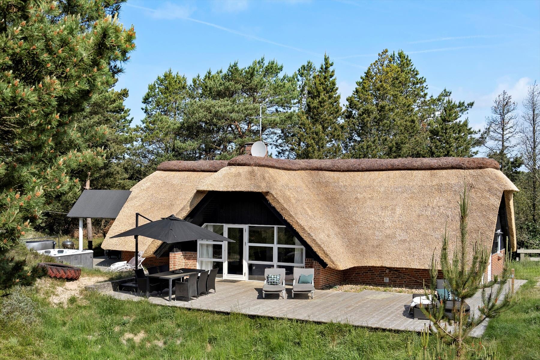 Sommerhusets store træterrasse er udstyret med alt, der kan gøre det udendørs driverliv ekstra sødmefuldt – inklusive kvalitetshavemøbler, gode liggestole og en grill, når aftensmaden skal tilberedes ude i det fri. Både parasollen og det overdækkede terrasseområde kan give skygge, hvis det er det, du trænger til, og lige meget hvor du slår dig ned, kan du nyde naturgrundens smukke og fredfyldte omgivelser. Også fra husets udespa har du udsigt til lilla lyng og krogede fyrretræer, og selv på årstider, hvor der er sne på stråtaget og de marehalmsklædte klitter, kan det føles helt magisk at sidde her i det varme vand.