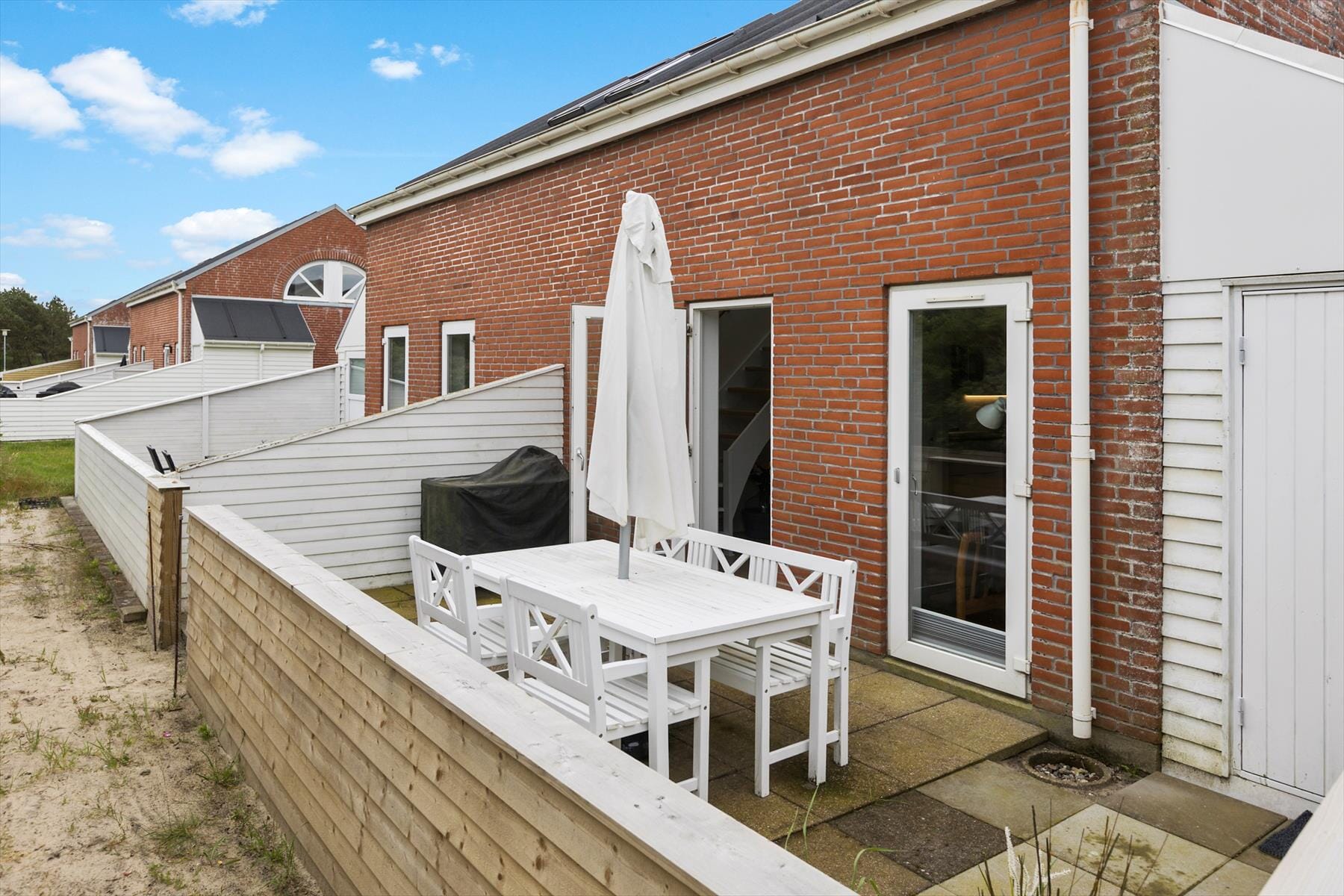 Hvis du har lavet iskaffe på en solrig sommerdag, er det eneste rigtige at tage den med ud for at drikke den i den friske luft. Der er terrasser på begge sider af huset, men den, der ligger i forlængelse af stuen vil formentlig blive favoritten, for den ligger mere ugeneret med afskærmning ind mod naboerne og med udsigt til et læbælte med duftende hybenbuske. Om aftenen har du og din familie mulighed for at grille – og hvis børnene har lyst til at lege mere, når aftensmåltidet er spist, er der kort afstand hen til feriecentrets nærmeste legeplads, hvor de kan gynge og brænde energi af i klatrestativet.