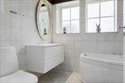 Med hvid vægfarve, lette gardiner og loft til kip er der en lys og indbydende atmosfære i stuen. Møblementet giver karakter til rummet og sørger for, at du kan sidde komfortabelt – og indbygningspejsen kan forvandle enhver aften til en særligt hyggelig stund. Det kan sommerhusets spabad også, for der er ikke noget så skønt som at kunne forkæle sig selv med et varmt bad, når dagen går på hæld. I alt er der to badeværelser, og planløsningen byder på tre soveværelser såvel som to hemse med ekstra madrasser.
