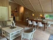 I den rummelige og hyggelige stue med åbent køkken og loft til kip, lyse vægge og masser af lysindfald fra vinduerne hele vejen rundt, er der gode muligheder for at spille kort eller måske brætspil ved spisebordet eller sofabordet. Du kan samtidig følge solens bane på den store udendørs terrasse og trække udendørs i skyggen under halvtaget på en varm sommerdag. Skulle familiens yngste eller ældste trænge til en lille lur er der ro og fred i den anden ende af huset, hvor værelserne er placeret.