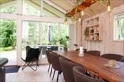 Indendørs fremstår sommerhuset lyst, indbydende og i moderne stil. Der er godt lysindfald i huset fra de store vinduer, især i stuen hvor der også er udgang til den store træterrasse. Sommerhusets hjerterum er den store stue, hvor der er åben forbindelse til køkkenet. Det er her alle kan samles om bordet og nyde en lækker brunch inden dagens aktiviteter og samles om aftenen til aftenhygge med brætspil og gode historier. I det dejlige badeværelse er der både spabad og sauna, så her har du virkelig mulighed for at blive forkælet. Sommerhusets rummelighed giver mulighed for at flere generationer mødes til en skøn ferie eller forlænget weekend.
