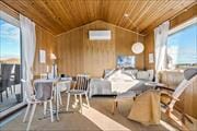 Udenfor finder du to dejlige terrasser, hvorfra du kan nyde udsigten til klitterne, der rejser sig mod himlen. Her kan du lade morgensolen varme dig, mens du nyder dagens første kop kaffe, eller samle familien til måltider under åben himmel. Når dagen er ved at være slut, og solen begynder at gå ned, kan I tage et friskt bad under den udendørs bruser – helt i pagt med naturen. Den korte afstand til havet gør det nemt at tage en tur ned til stranden, hvor børnene kan bygge sandslotte, og de voksne kan slentre barfodet i vandkanten.