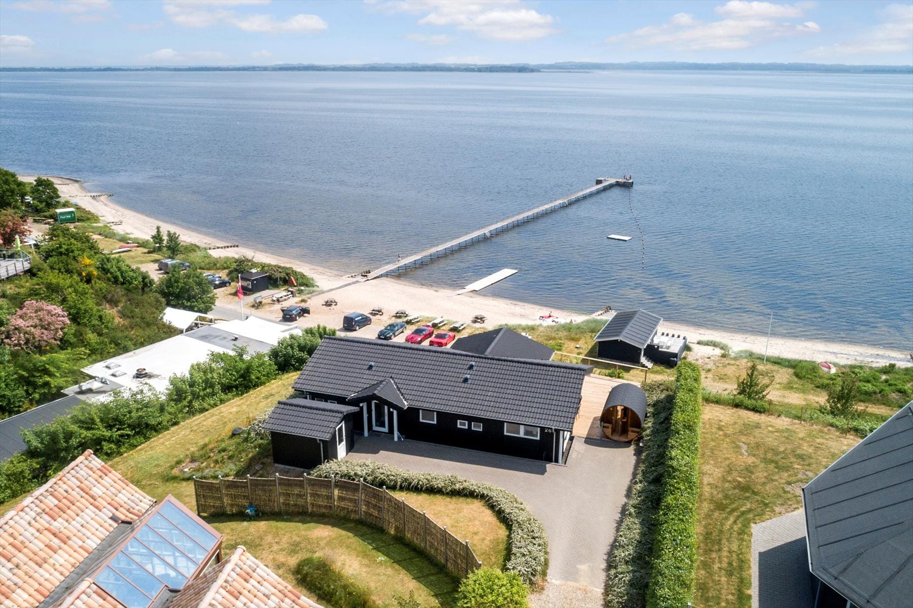 Da sommerhuset blev opført i 2010, blev det placeret helt rigtigt på grunden, så I får størst glæde af fjordudsigten. Stuen er udstyret med et kæmpe vinduesparti, der går fra gulv til loft, og takket være opholdsafdelingens åbne forbindelse, kan I også beundre vandomgivelserne, når I står i køkkenet. To af de tre soveværelser vender som tidligere nævnt også ud mod fjorden, og fra det ene har I endda direkte adgang til terrassen. Sommerhuset har for øvrigt god wi-fi-forbindelse og fladskærms-tv med Chromecast, og det store badeværelse er på lækker vis indrettet med spabad.