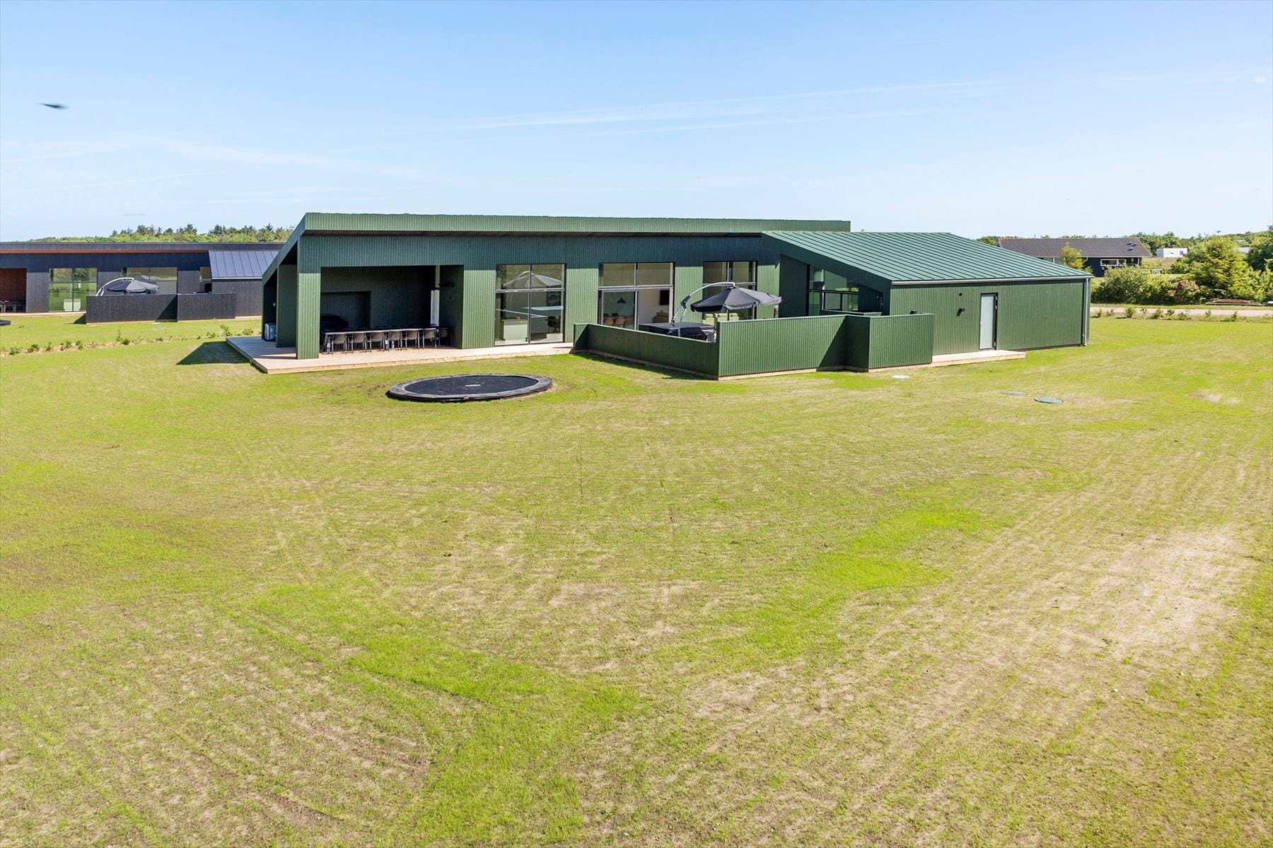 Når solen skinner, eller vinden er mild, rykker ferien helt naturligt udenfor – og her lever huset i den grad op til feriedrømmene. Den store terrasse strækker sig rundt om huset og byder både på åbne og overdækkede områder, så du altid kan finde en plads i solen – eller i skyggen. Om aftenen kan I tænde op i grillen og runde dagen af med et glas vin i udespaen, mens stjernerne langsomt toner frem på nattehimlen. Det varme, boblende vand og den friske luft skaber ren wellnessstemning, og måske er det netop her, du finder din nye yndlingsstund. Haven er stor og grøn – perfekt til boldspil, solbadning eller en afslappende lur på et tæppe. Trampolinen giver børnene timevis af sjov og leg, mens de voksne slapper af med en god bog eller en kop kaffe i liggestolen.