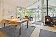 Sommerhuset er et klassisk og lyst sommerhus, hvor naturen og lyset strømmer ind gennem de store vinduer. I kan glæde jer til mange gode timer sammen i husets samlingsrum, hvor køkken, spisebordsplads og stuen er i åben forbindelse med hinanden. Køkkenet er afskærmet af en halvmur, hvor man kan lave mad og stadig nyde udsigten og tale med dem, der allerede har sat sig ved spisebordet. Ved spisebordet er et stort glasparti i gavlen, som giver en flot udsigt til vandet og adgang til den overdækkede terrasse.