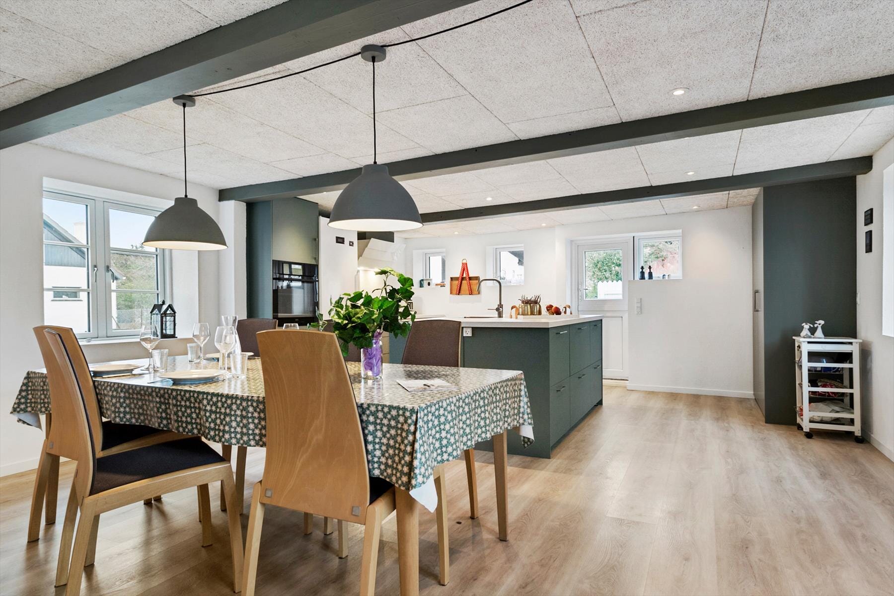Dette hus er både fuld af hygge og har god plads til i alt 6 voksne og et barn. Den praktiske entré bliver man uden tvivl glad for, for her er plads til alle jakker og sko. Huset byder også på et dejligt åbent køkken, hvor man kan stå ved køkkenøen og tilberede feriens måltider, mens man snakker med dem, der allerede har sat sig ved spisebordet. Køkkenet er lyst og med alle de nødvendige faciliteter. Der er direkte udgang til en terrasse fra køkkenet, så her er det oplagt at tage sine måltider med udenfor, når vejret tillader det.