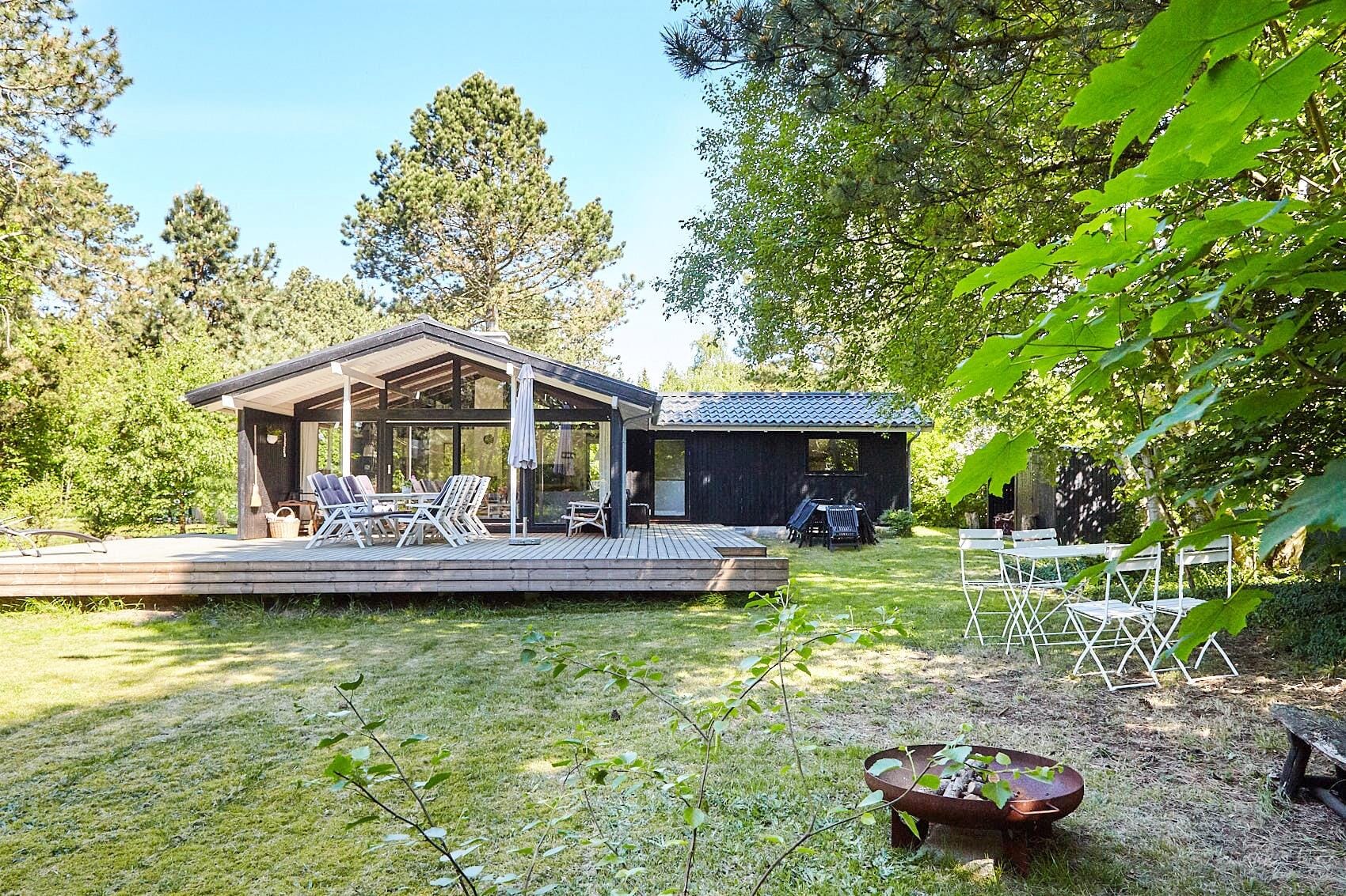 Udendørs er der nogle rigtig skønne omgivelser på den store grund. Her er både have, naturgrund og en lille å der løber igennem grunden. Der er derfor god plads til udendørsaktiviteter som boldspil eller andre medbragte havespil. Der kan slappes af på en af sommerhusets gode terrassearealer, hvor der både er åben terrasse og god overdækket terrasse hvor man kan søge ly når duggen falder på om aftenen. Efter en lang dag kan I samles omkring bålet til en hyggelig aften og dele dagens gode ferieoplevelser, måske endda med snobrød.