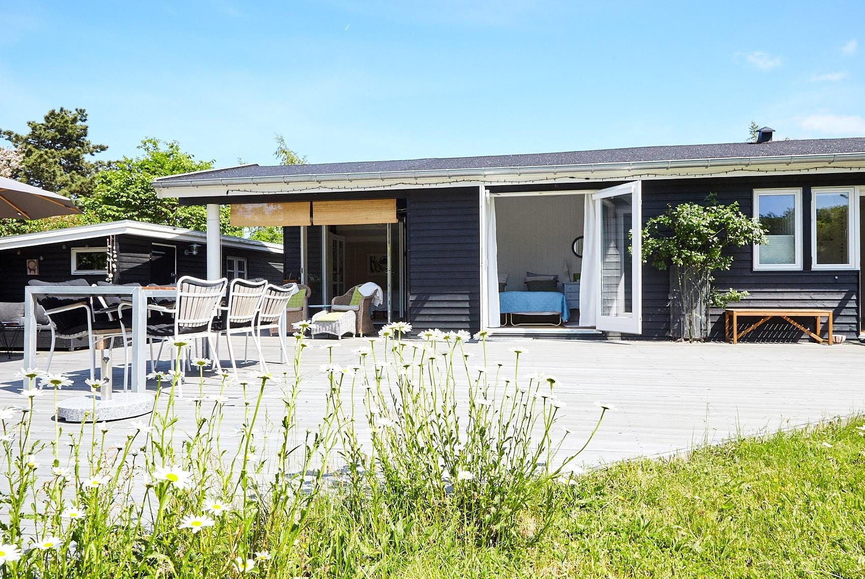 Dejligt sommerhus beliggende tæt på en god og børnevenlig sandstrand og kun få minutters gang til skoven. Feriehuset byder på mange gode og hyggelige stunder udendørs på den store træterrasse, hvor eftermiddags- og aftensolen kan nydes. Grunden er godt aflukket så der kan slappes af i ugenerte omgivelser. En god kop kaffe kan nydes foran bålet eller i en af de gode og hyggelige læ kroge der er på grunden.