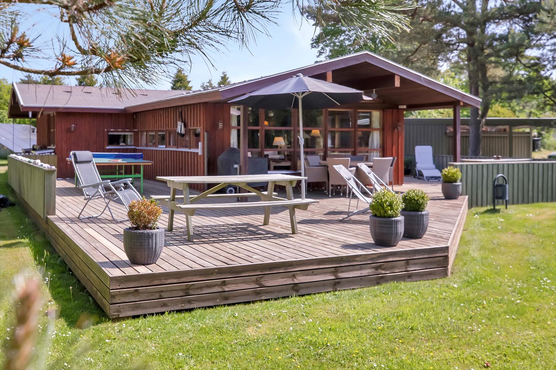Sommerhuset er indrettet med en dejlig stue bl.a. med stor Viasat tv-pakke. I forbindelse med stuen er der et skønt, åbent køkken hvor I kan hjælpes om at tilberede frokosten. Der er et lækkert badeværelse med brus og sauna samt et dejligt soveværelse med god skabsplads og et ekstra værelse. NB! Der er også tv på begge værelser. Husets terrasse er dels overdækket og så er der 120 m2 fantastisk åben afdeling, her kan der grilles, nydes et glas vin eller solen fra morgen til aften. I det tilhørende skur er der køleskab med frys, vaskemaskine og diverse spil. Alt fremstår særdeles indbydende og helt ideelt til dig der bare vil nyde livet.