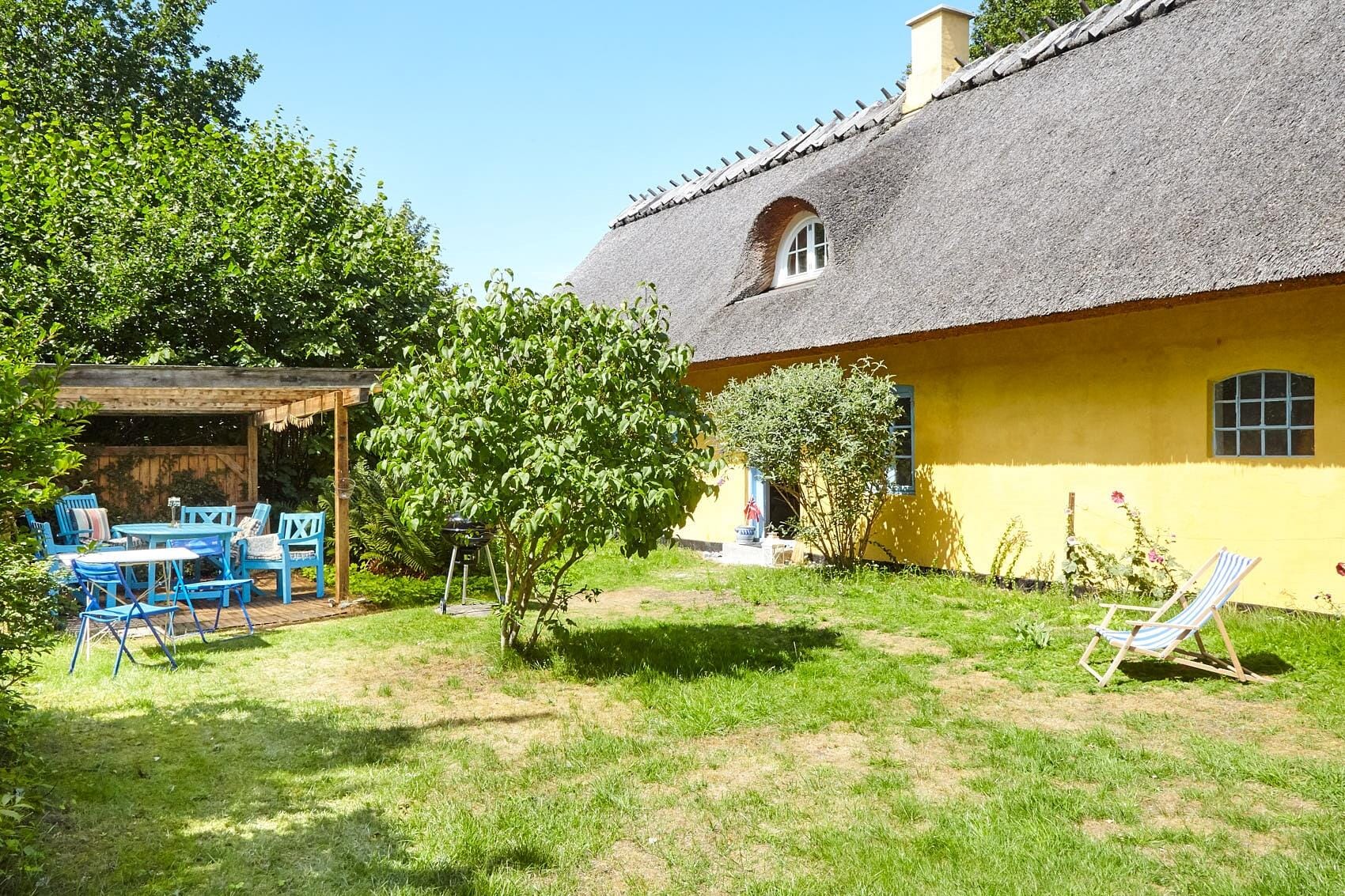 Skønt historisk sommerhus med stråtag og fantastisk overdækket terrasse.